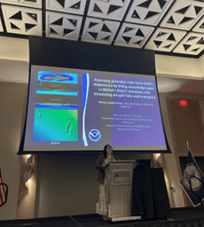 During a special session, Ainsley Vanderhyde delivered an oral presentation focused on environmental risks associated with WWII shipwrecks. Her work addressed data gaps in NOAA’s RULET database and modeled potential oil spill scenarios.